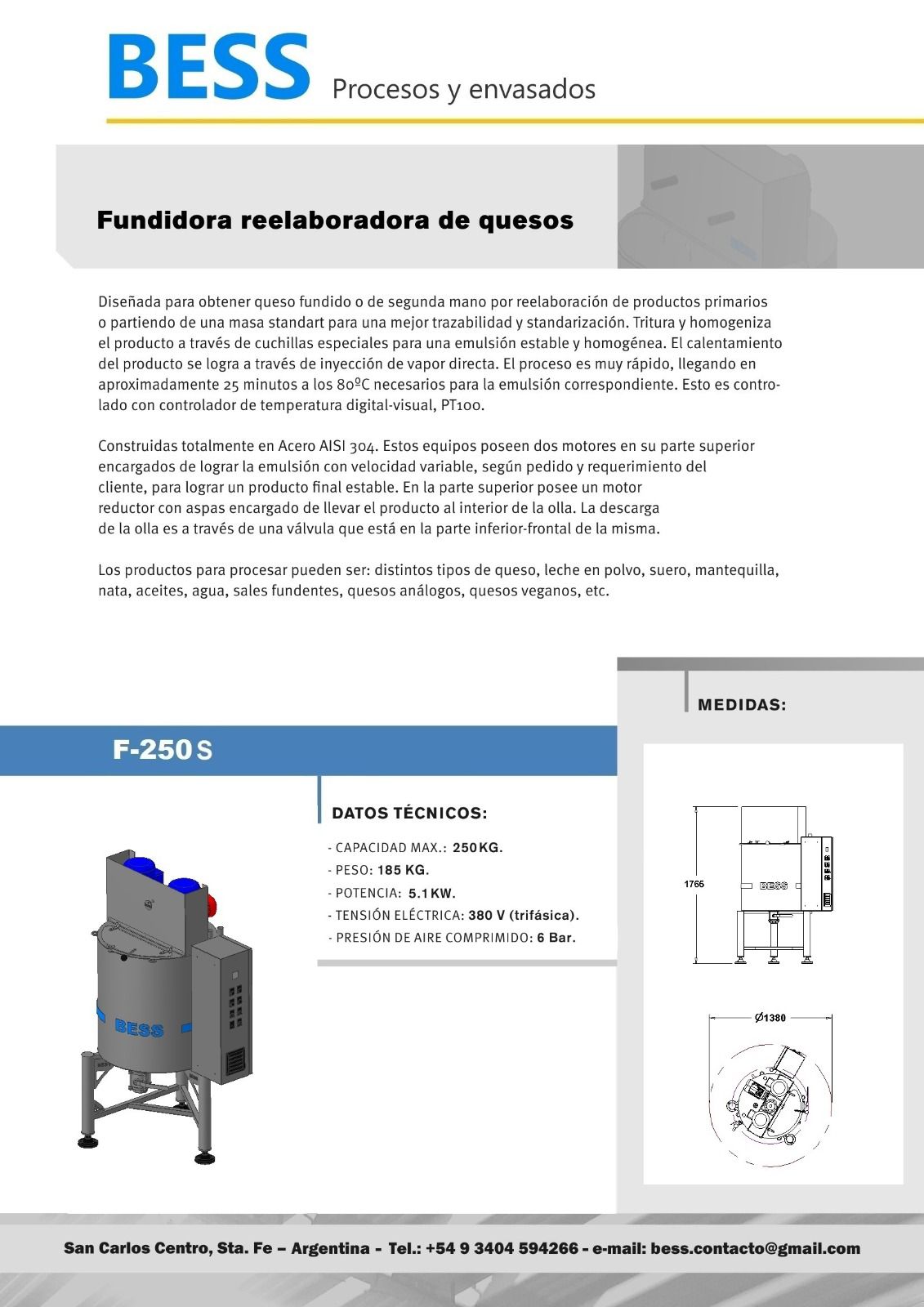 Diseñada para obtener queso fundido o de segunda mano por reelaboración de productos primarios o partiendo de una masa standrt para una mejor trazabilidad y estandarización. Tritura y homogeneiza el producto a través de cuchillas especiales para una emulsión estable y homogénea. El calentamiento del producto se logra a través de inyección de vapor directa. El proceso es muy rápido, llegando en aproximadamente 25 minutos a los 80°C necesarios para la emulsión correspondiente. Esto es controlado con controlador de temperatura digital-visual, Pt100.