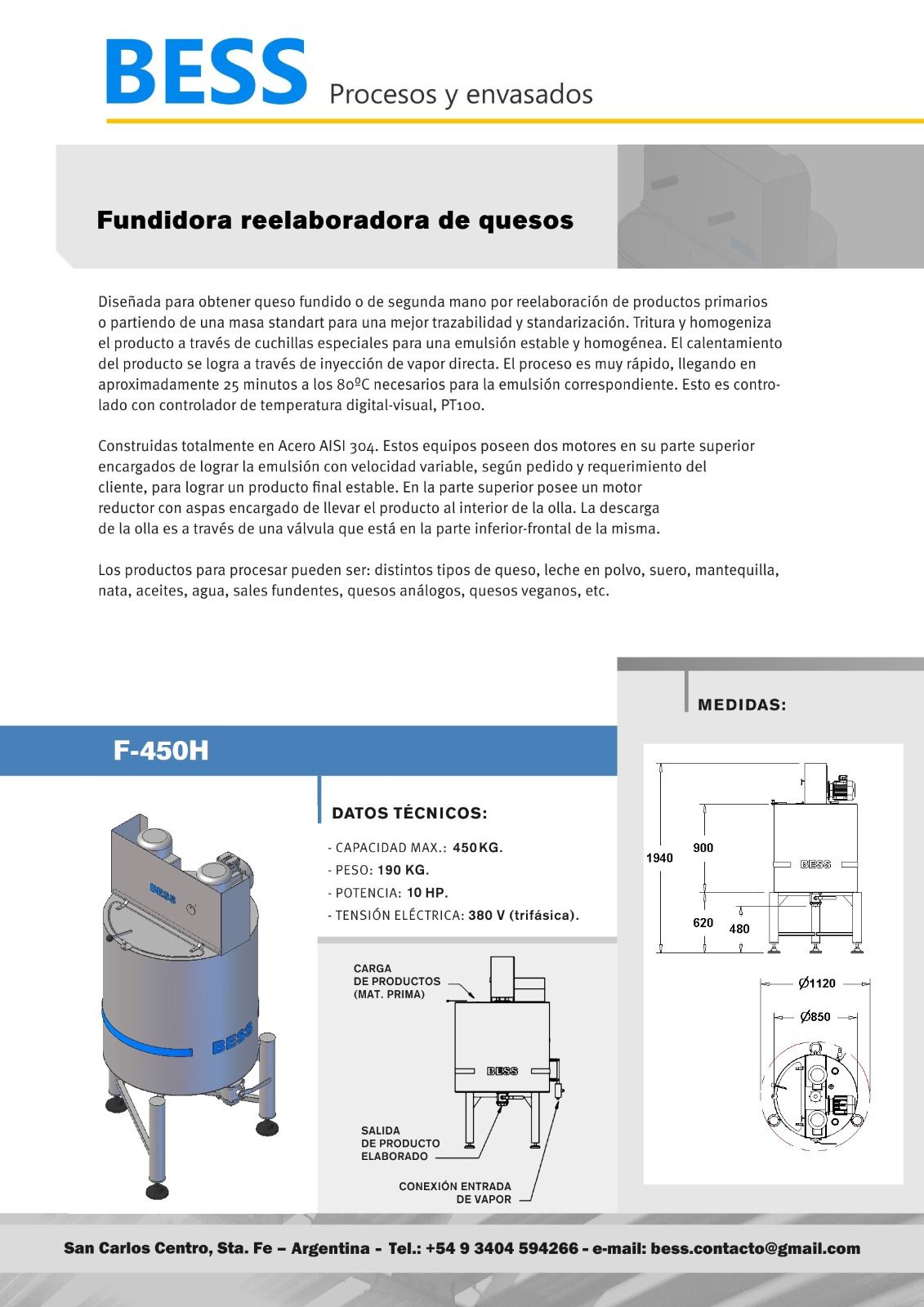Diseñada para obtener queso fundido o de segunda mano por reelaboración de productos primarios o partiendo de una masa standart para una mejor trazabilidad y estandarización. Tritura y homogeniza el producto a través de cuchillas especiales para una emulsión estable y homogénea. El calentamiento del producto se logra a través de inyección de vapor directa. El proceso es muy rápido, llegando en aproximadamente 25 minutos a los 80ºC necesarios para la emulsión correspondiente. Esto es controlado con controlador de temperatura digital-visual, PT100.
